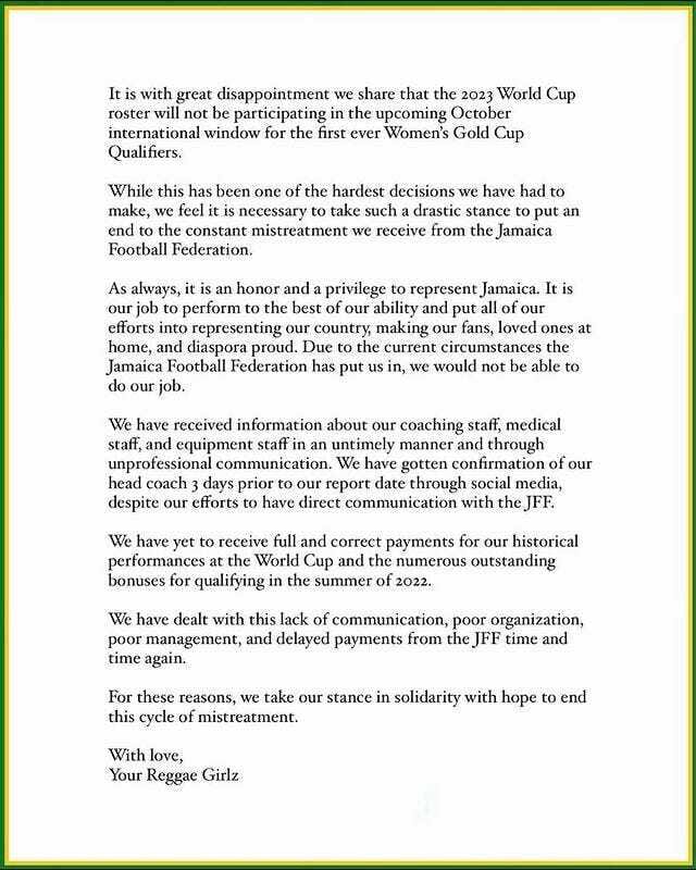 The Jamaica National Team players released a statement that they would not participate in the W Gold Cup tournament “due to the current circumstances the Jamaica Football Federation has put us in”.